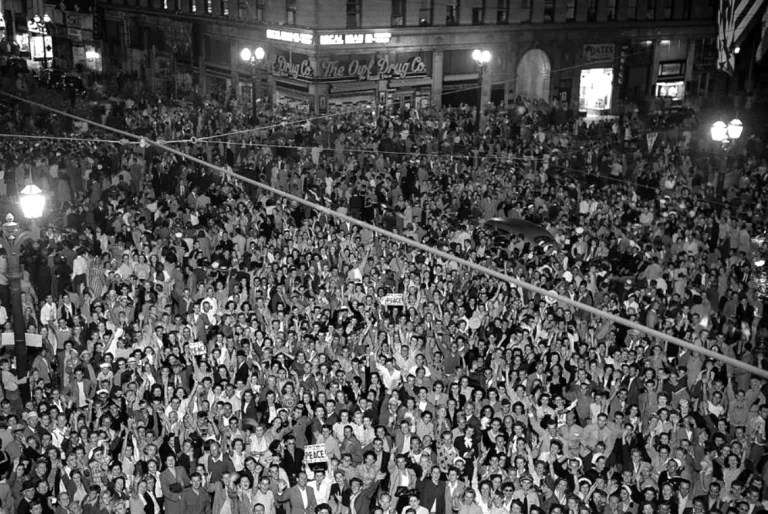 Crowds at the corner of Hollywood and Vine celebrating surrender of Japan, ending World War II – VJ Day, August 14, 1945