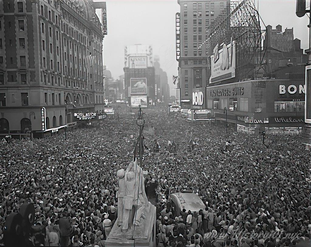 750,000 people gathered in “Times Square” to Celebrate Victory over Japan Day (V-J Day), following announcement of Japan’s acceptance of Postdam Declaration of unconditional surrender. Image Credit: Unknown. Reprinted with permission.