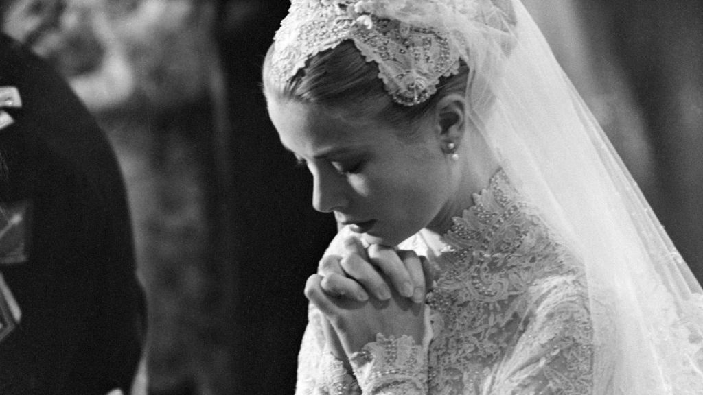 Grace Kelly, kneeing at the altar on her wedding day, April 1956. Credit: Getty Images